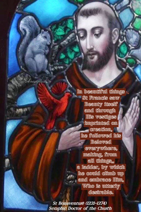 “In beautiful things St Francis saw Beauty itself and through His vestiges imprinted on creation, he followed his Beloved everywhere, making, from all things, a ladder, by which he could climb up and embrace Him, Who is utterly desirable.”
