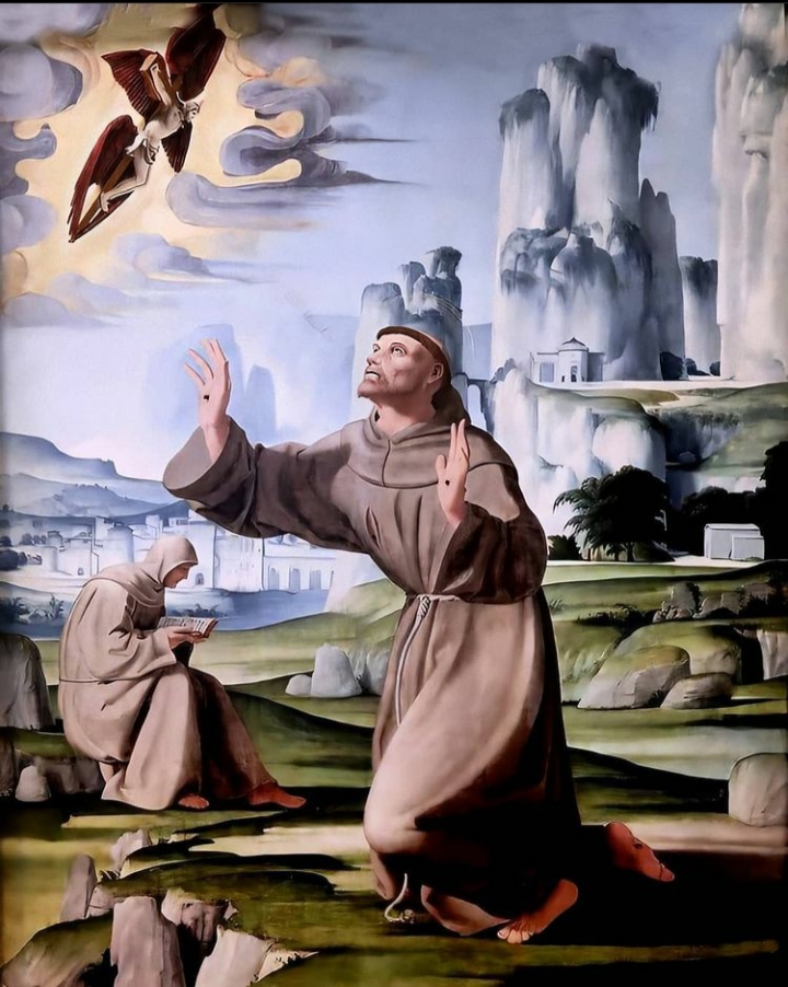 One morning, about the Feast of the Exaltation of the Holy Cross, as he was praying on the mountain side, he saw what appeared to be a Seraph, with six shining and fiery wings, coming down from Heaven. The vision flew swiftly through the air and approached the man of God, Who then perceived that it was not only winged but also Crucified; for the Hands and Feet were stretched out and fastened to a Cross; while the wings were arranged in a wondrous manner, two being raised above the head, two outstretched in flight and the remaining two crossed over and veiling the whole body. As he gazed, Francis was much astonished,and his soul was filled with mingled joy and sorrow. The gracious aspect of Him, Who appeared in so wonderful and loving a manner, gave Francis exceeding joy, while the sight of His cruel Crucifixion pierced his heart with a sword of sorrowing compassion.