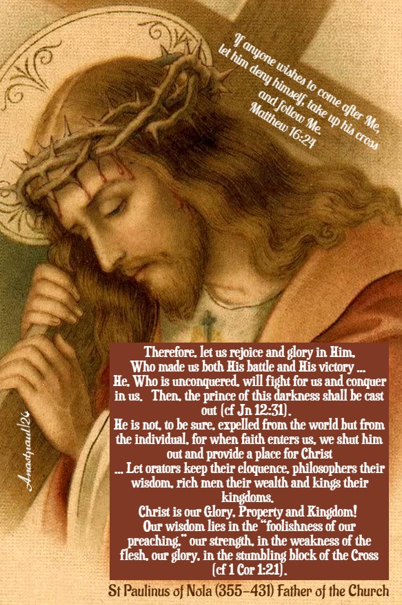 Let orators keep their eloquence, philosophers their wisdom, rich men their wealth and kings their kingdoms. Christ is our Glory, Property and Kingdom! Our wisdom lies in the “foolishness of our preaching,” our strength, in the weakness of the flesh, our glory, in the stumbling block of the Cross (cf 1 Cor 1:21).” – St Paulinus of Nola (355-431) Bishop, Father of the Church (Letter 38:3-4.6).
