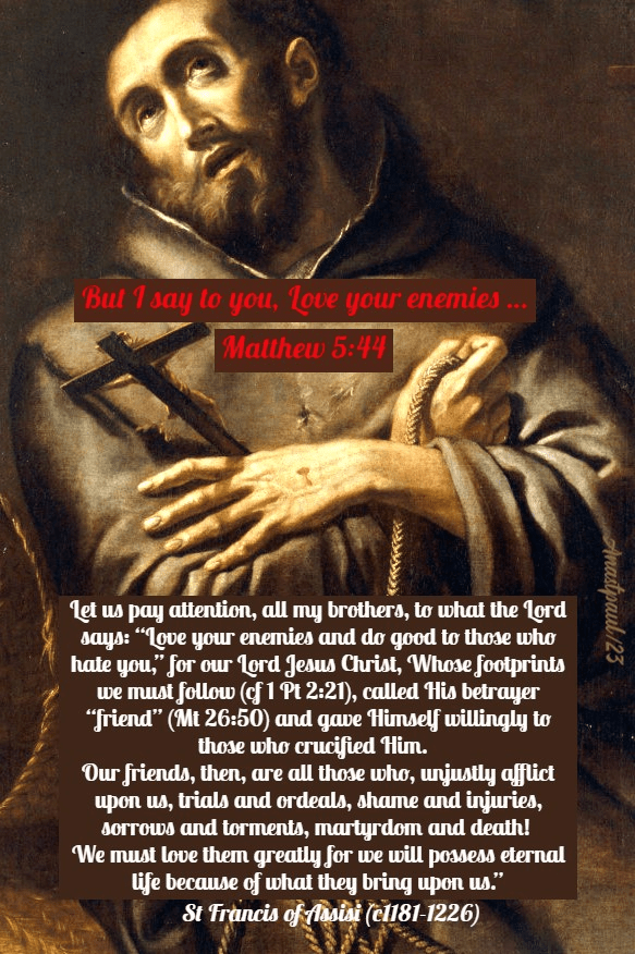 REFLECTION – “Let us pay attention, all my brothers, to what the Lord says: “Love your enemies and do good to those who hate you,” for our Lord Jesus Christ, Whose footprints we must follow (cf 1 Pt 2:21), called His betrayer “friend” (Mt 26:50) and gave Himself willingly to those who crucified Him. Our friends, then, are all those who, unjustly afflict upon us, trials and ordeals, shame and injuries, sorrows and torments, martyrdom and death! We must love them greatly for we will possess eternal life because of what they bring upon us.” – St Francis of Assisi (c1181-1226) Founder of the Friars Minor (Earlier Rule, #22).