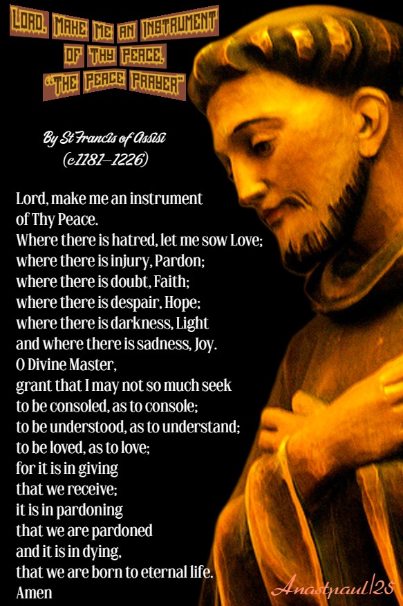 Lord, make me an instrument of Thy Peace. Where there is hatred, let me sow Love; where there is injury, Pardon; where there is doubt, Faith; where there is despair, Hope; where there is darkness, Light and where there is sadness, Joy. O Divine Master, grant that I may not so much seek to be consoled, as to console; to be understood, as to understand; to be loved, as to love; for it is in giving that we receive; it is in pardoning that we are pardoned and it is in dying, that we are born to eternal life. Amen