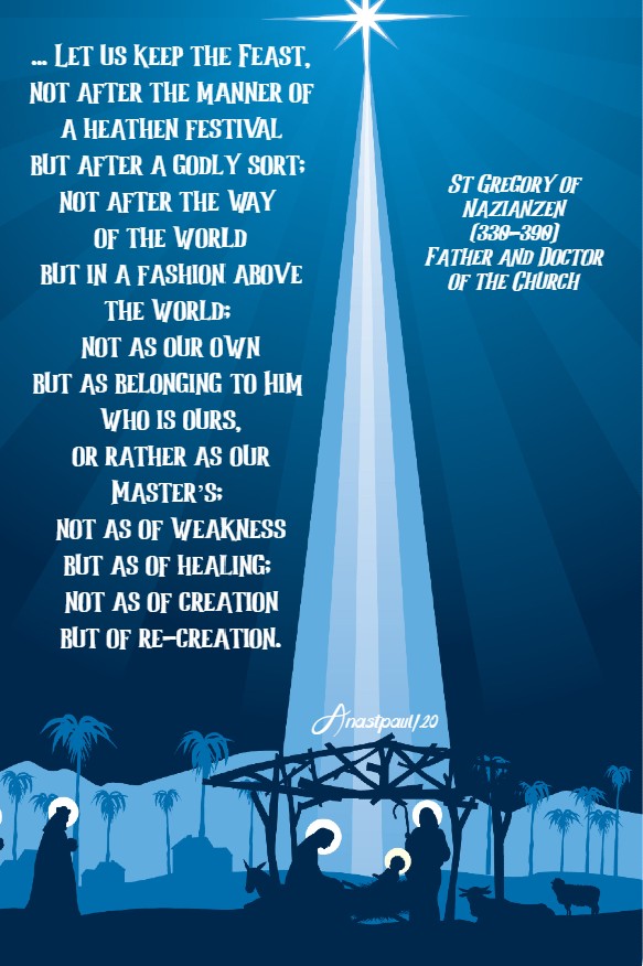 “… Let us keep the Feast, not after the manner of a heathen festival but after a Godly sort; not after the way of the world but in a fashion above the world; not as our own but as belonging to Him Who is ours, or rather as our Master’s; not as of weakness but as of healing; not as of creation but of re-creation.”