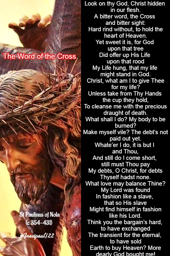 “The Word of the Cross Look on thy God, Christ hidden in our flesh. A bitter word, the Cross and bitter sight: Hard rind without, to hold the heart of Heaven. Yet sweet it is, for God upon that tree Did offer up His Life upon that rood My Life hung, that my Life might stand in God. Christ, what am I to give Thee for my life? Unless take from Thy Hands the cup they hold, To cleanse me with the precious draught of death. What shall I do? My body to be burned? Make myself vile? The debt’s not paid out yet. Whate’er I do, it is but I and Thou, And still do I come short, still must Thou pay My debts, O Christ, for debts Thyself hadst none. What love may balance Thine? My Lord was found In fashion like a slave, that so His slave Might find himself in fashion like his Lord. Think you the bargain’s hard, to have exchanged The transient for the eternal, to have sold Earth to buy Heaven? More dearly God bought me!