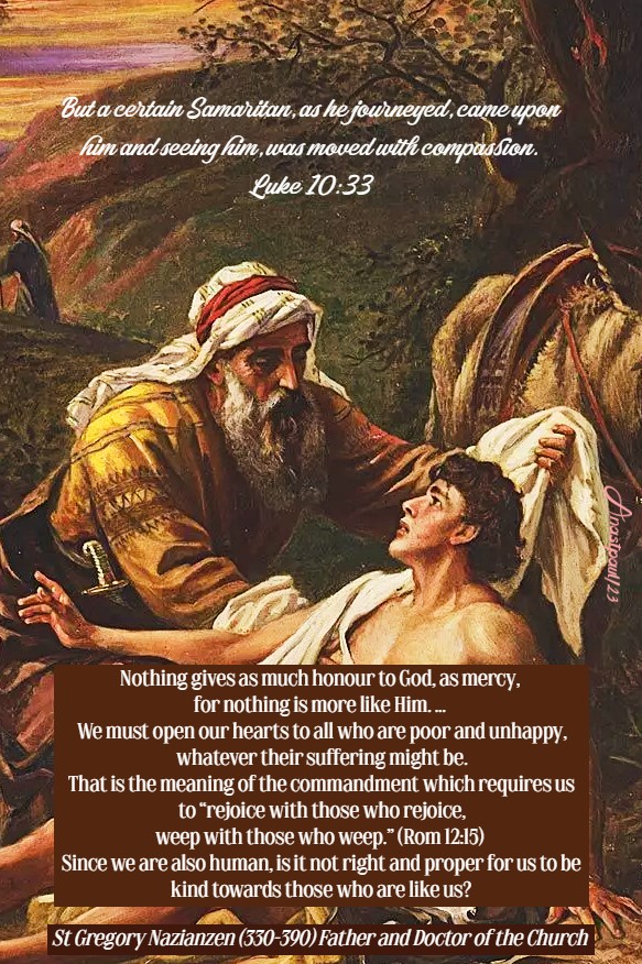 We must open our hearts to all who are poor and unhappy, whatever their suffering might be. That is the meaning of the commandment which requires us to “rejoice with those who rejoice, weep with those who weep.” (Rom 12:15) Since we are also human, is it not right and proper for us to be kind towards those who are like us?” – St Gregory Nazianzen (330-390) Bishop, Father and Doctor of the Church (On Love of the Poor, 4-6).