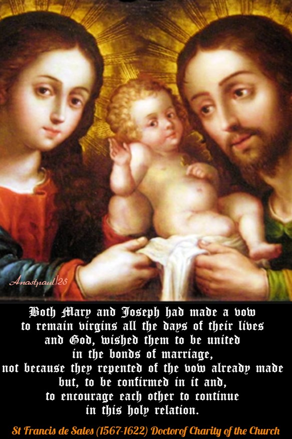 “Both Mary and Joseph had made a vow to remain virgins all the days of their lives and God, wished them to be united in the bonds of marriage, not because they repented of the vow already made but, to be confirmed in it and, to encourage each other to continue in this holy relation.”