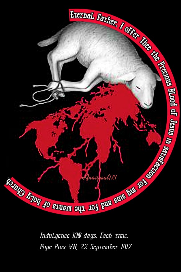 Eternal Father, I offer Thee the Precious Blood of Jesus in satisfaction for my sins and for the wants of holy Church. – Indulgence 100 days, Each time, Pope Pius VII, 22 September 1817.