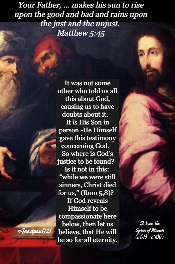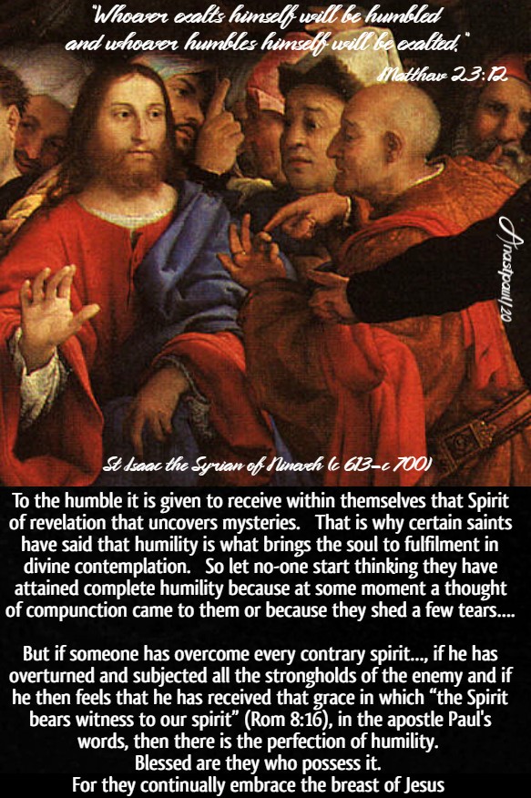 Satan himself fears nothing as much as prayer offered during the night watches. Even if they are accompanied by distractions, it does not return fruitless, as long as something inappropriate is not being asked for. That is why Satan engages in severe combat against those who keep watch at night, so as to deter them from this practice if he can, especially if they show themselves to be persevering. But those who are in any way defended against his pernicious wiles and have tasted the gifts God grants, at these times of vigil and, have had personal experience, of the greatness of the help God gives them, wholly despise him, he and all his craftiness.” – St Isaac the Syrian of Nineveh (c613-c700) Bishop of Nineveh, Monk at Mosul, Father of the Church (Ascetical Discourses)