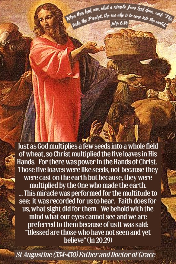 This miracle was presented to our senses, in order to stimulate our minds… and so make us marvel at “the God we do not see because of his works, which we do see” (Rom 1,20). For then, when we have been raised to the level of faith and purified by faith, we shall long to behold, though not with our eyes, the invisible God Whom we recognise through what is visible. This miracle was performed for the multitude to see; it was recorded for us to hear. Faith does for us, what sight did for them. We behold with the mind what our eyes cannot see and we are preferred to them because of us, it was said: “Blessed are those who have not seen and yet believe” (Jn 20,29). – St Augustine (354-430) Father and Doctor of Grace – Homilies on Saint John’s gospel, 24, 1.6.7.