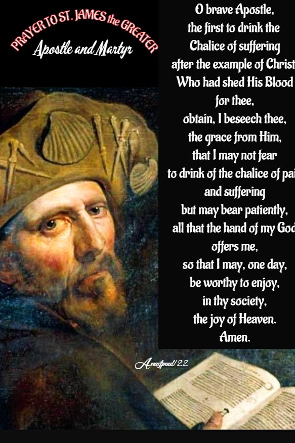 PRAYER TO ST. JAMES O brave Apostle, the first to drink the Chalice of suffering after the example of Christ, Who had shed His Blood for thee, obtain, I beseech thee, the grace from Him, that I may not fear to drink of the Chalice of pain and suffering but may bear patiently, all that the hand of my God offers me, so that I may, one day, be worthy to enjo, in thy society, the joy of Heaven. Amen.