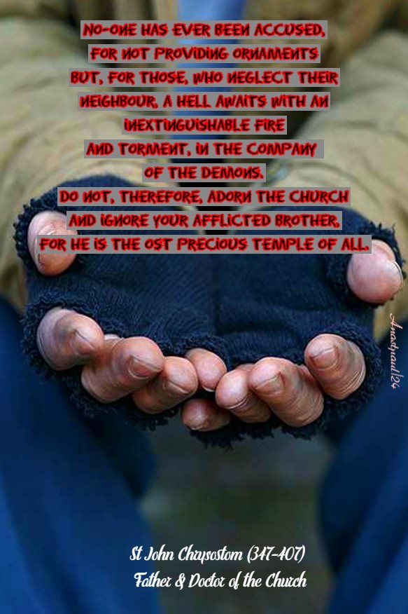“The story is told of St John of God who, on one occasion, when he was finding it difficult to provide for the crowds of sick people, whom he had in his hospital, he went about the streets of Granada, crying: “My dear brothers, give alms to yourselves!”