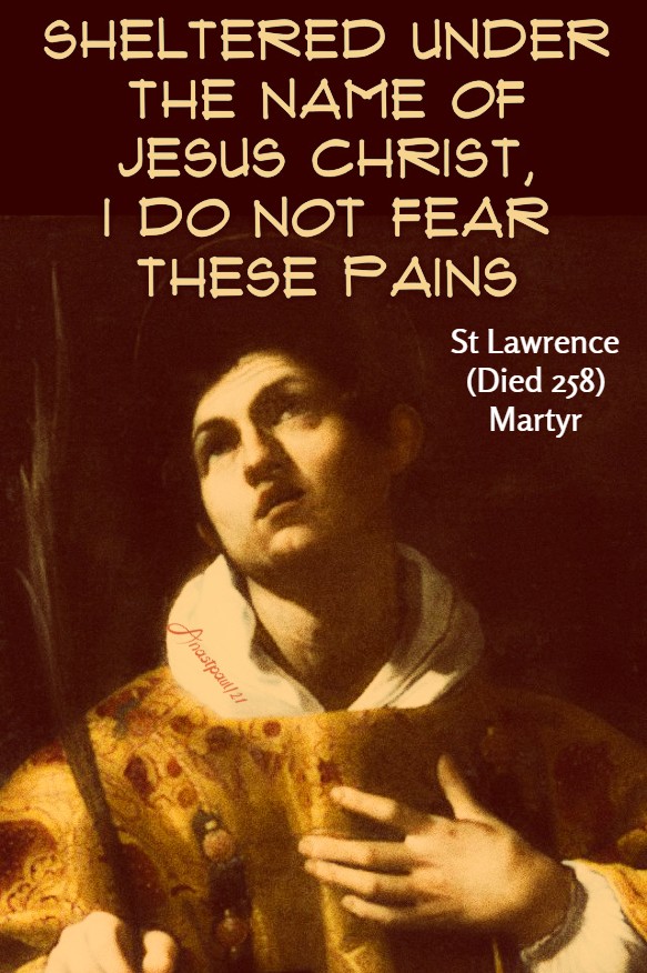 St Lawrence (Died 258) Martyr “Keeper of the Treasures of he Church,” Martyr, Archdeacon. St Lawrence was one of the seven Deacons of the City of Rome under Pope St Sixtus II, who were martyred in the persecution of the Christians by decree of the Roman Emperor Valerian. St Lawrence here: https://anastpaul.wordpress.com/2017/08/10/saint-of-the-day-feast-of-st-lawrence-of-rome-martyr/