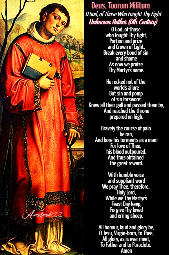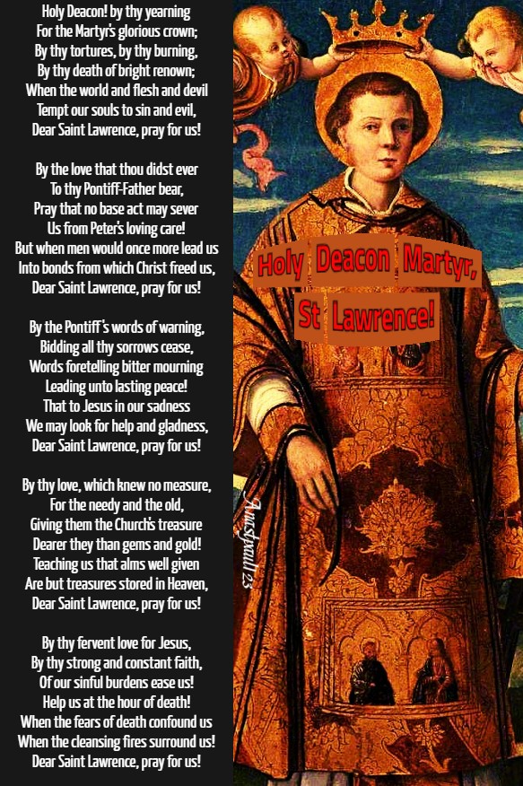 Holy Deacon! by thy yearning For the Martyr’s glorious crown; By thy tortures, by thy burning, By thy death of bright renown; When the world and flesh and devil Tempt our souls to sin and evil, Dear Saint Lawrence, pray for us!