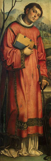 He was born of Christian parents, in the middle of the Third Century, at Osca, a City in Aragon. His father’s name was Orentius, his mother’s, Patientia, both are honoured as Saints. Such parents gave a holy education to their son. He early evinced, on all occasions, an especial love for God, a fearless constancy in the true faith and a watchful care over the preservation of his purity. While yet young in years, he went to Rome and won, by his blameless life, the highest regard of all who came in contact with him. Pope Xystus or Sixtus Ordained him Deacon. His functions were to serve the Pope at the Altar, to take charge of the treasures of the church and to distribute the revenues which were destined for the maintenance of the sextons and the poor.