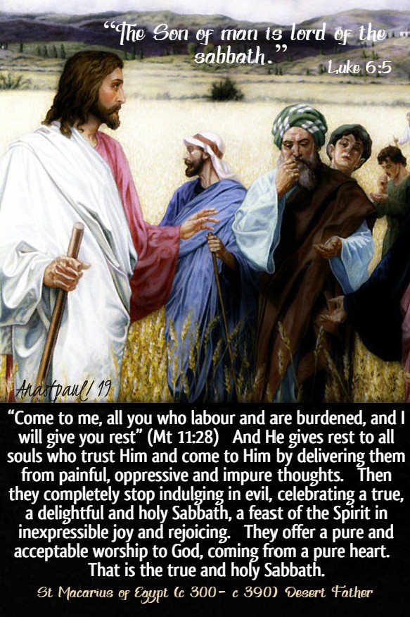 REFLECTION – “In the Law given by Moses, which was a shadow of things to come (Col 2:17), God commanded everyone to rest and to do no work on the Sabbath. But this was a symbol and foreshadowing of the true Sabbath, which is bestowed on the soul by the Lord (…) For the Lord calls on us to rest, telling us: “Come to me, all you who labour and are burdened, and I will give you rest” (Mt 11:28) And He gives rest to all souls who trust Him and come to Him by delivering them from painful, oppressive and impure thoughts. Then they completely stop indulging in evil, celebrating a true, a delightful and holy Sabbath, a feast of the Spirit in inexpressible joy and rejoicing. They offer a pure and acceptable worship to God, coming from a pure heart. That is the true and holy Sabbath.