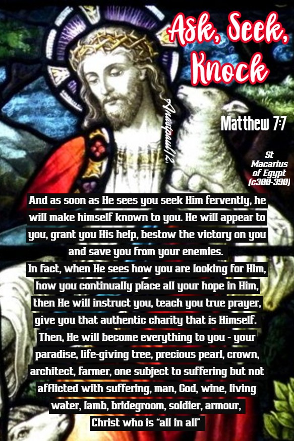 Just as a child cannot feed or take care of itself but can only look at its mother and cry until she takes pity and gives it her attention, so believing soul,s always hope in Christ and attribute to Him, all righteousness. As the shoot withers if it is separated from the vine (Jn 15,6) so does someone who wants to become faultless apart from Christ. Just as “someone is a thief and robber who does not enter the sheepfold through the gate but climbs over elsewhere” (Jn 10,1), so it is with someone, who wants to become just, without Him who justifies.” – St Macarius of Egypt (c 300-390) Monk – Spiritual Homilies no 30, 3-4