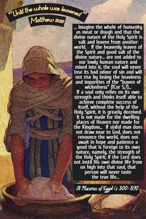 REFLECTION – “If someone kneads bread without mixing leaven into it, they may well apply themselves to the task, knead and work at it, the dough will not rise and cannot be used as food. But when leaven has been mixed in, it draws all the dough to itself and makes it all rise, as in the parable the Lord applied to the Kingdom… It is the same with meat – no matter how much care you take, if you neglect to put in salt to preserve it,… it will smell badly and become inedible In the same sort of way, imagine the whole of humanity as meat or dough and that the divine nature of the Holy Spirit is salt and leaven from another world. If the heavenly leaven of the Spirit and good salt of the divine nature… are not added to our lowly human nature and mixed into it, the soul will never lose its bad odour of sin and will not rise by losing the heaviness and impurities of the “leaven of wickedness” (1Cor 5,7)…