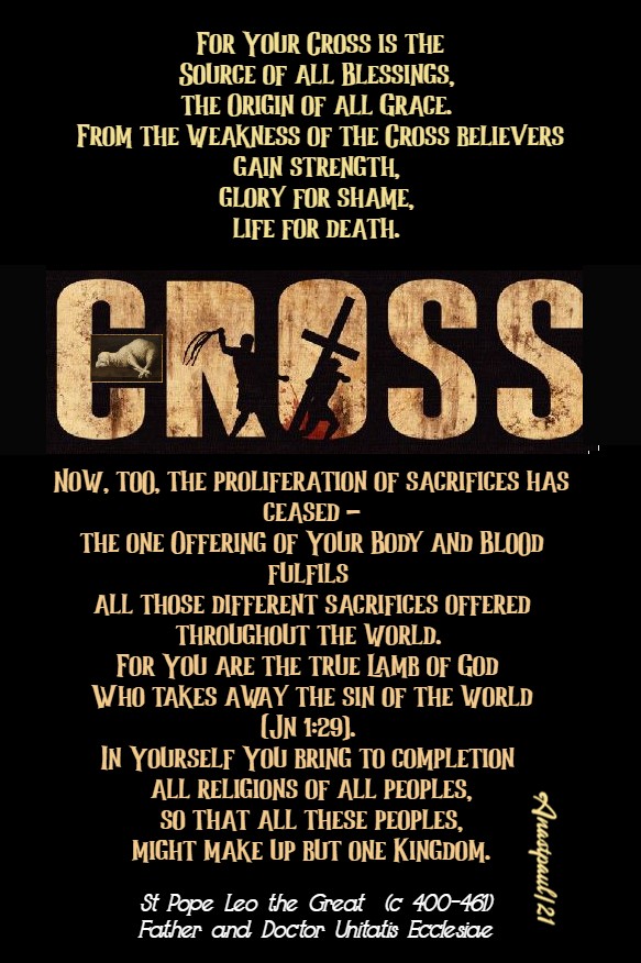 But those who enjoy the things that are above and eternal, rather than earthly and perishable, possess an incorruptible, hidden store, of which the prophet speaks: ‘Our treasure and salvation have come, wisdom and instruction and piety, from the Lord: these are the treasures of justice.’ Through these, with the help of God’s grace, even earthly possessions are transformed into heavenly blessings. It is a fact that many people use the wealth, which is either rightfully left to them or otherwise, acquired, as a tool of devotion. By distributing what might be superfluous to support the poor, they are amassing imperishable riches, so that what they have discreetly given, cannot be subject to loss. They have properly placed those riches, where their heart is, – it is a most blessed thing, to work to increase such riches, rather than to fear that they may pass away.” – St Pope Leo the Great (400-461) Bishop of Rome and Great Western Father and Doctor of the Church (An excerpt from Sermon 92).