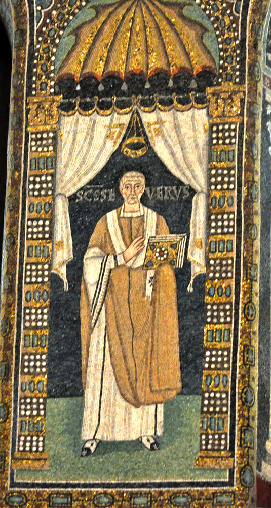 The great testimony of the cult paid to him in Ravenna are the mosaics of St Apollinare in Classe (consecrated in 549), located in the lower part of the apse, representing the Bishops St Severus, St Orsius, Ecclesius and Ursicinus, the first two bear the title “Sanctus” proof of this certain cult.