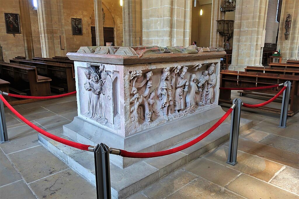 The marble bas-reliefs placed on the 14th Century Tomb in the Saint’s Church in Erfurt, depict him dressed in Bishop’s robes, surrounded by the figures of his wife and daughter, in a devout act of prayer.