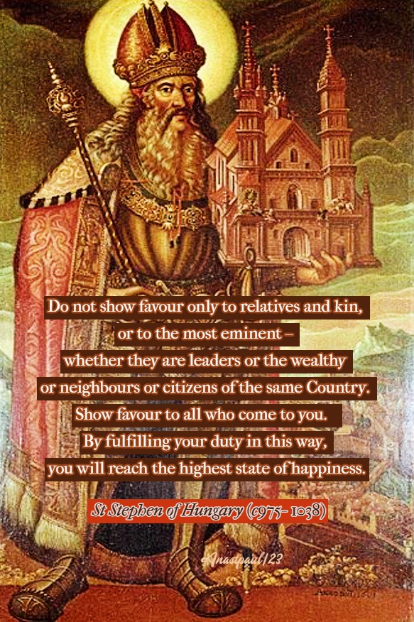 REFLECTION – “Do not show favour only to relations and kin, or to the most eminent – whether they are leaders or the wealthy or neighbours or citizens of the same country. Show favour to all who come to you. By fulfilling your duty in this way, you will reach the highest state of happiness.”…St Stephen of Hungary