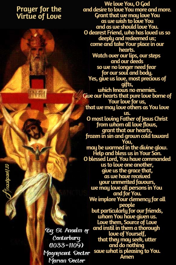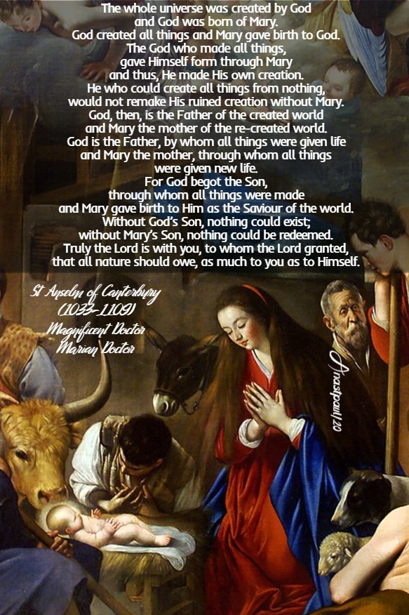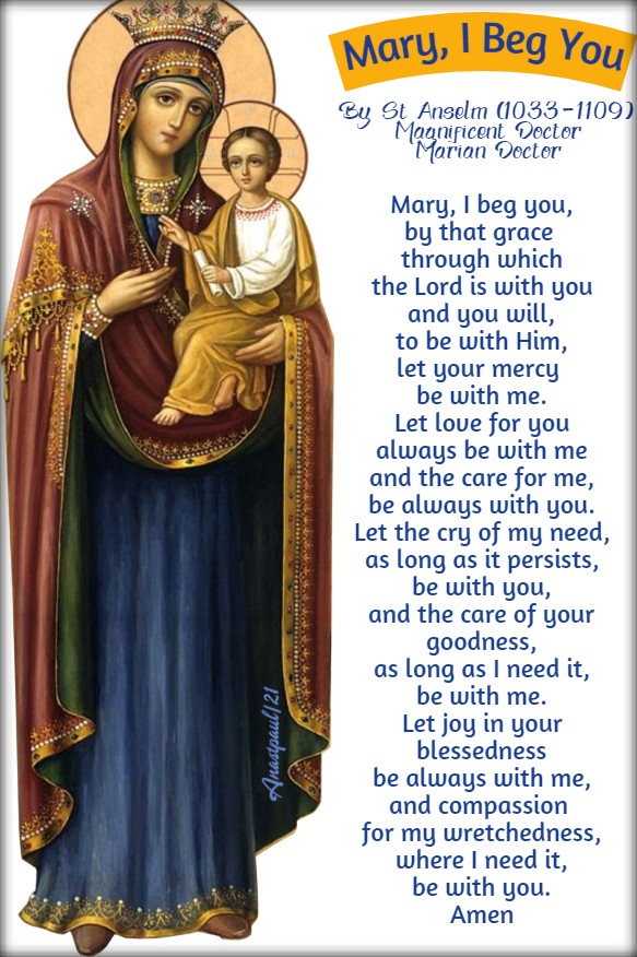 PRAYER – Holy almighty God, in Your wisdom You created us and by Your providence You rule and feed us with the bread of life, Your Divine Son Penetrate our inmost being with Your holy light, so that our way of life may always be one of faithful service, as we follow Your Son, who leads us to eternal life. May the prayers of Mary our Mother and St AAnselm, help us to shine Your light on our neighbour. Through Christ our Lord, with the Holy Spirit, God forever, amen.