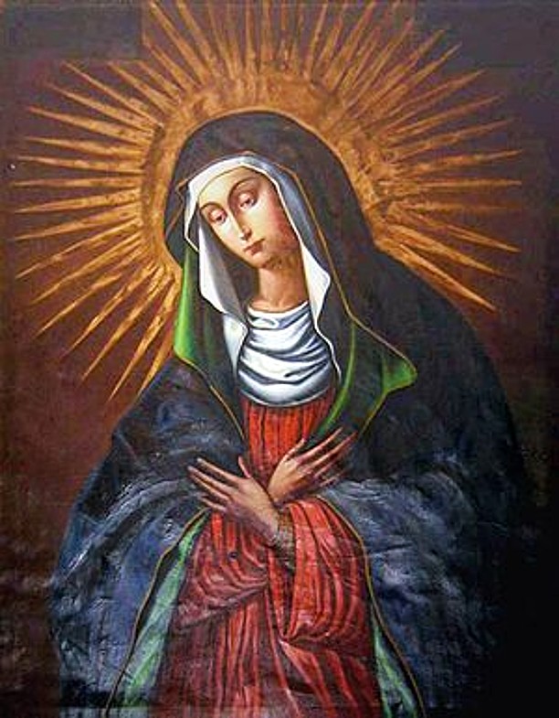 This Marian Title is the prominent Catholic painting of the Blessed Virgin Mary venerated by the faithful in the Chapel of the Gate of Dawn in Vilnius, Lithuania. The painting was historically displayed above the Vilnius City Gate; city gates of the time often contained religious artefacts intended to ward off attacks and bless passing travellers. The painting is in the Northern Renaissance style and was completed most likely around 1630. The Virgin Mary is depicted without the infant Jesus. The artwork soon became known as miraculous and inspired a following. A dedicated Chapel was built in 1671 by the Discalced Carmelites. At the same time, the painting was covered in expensive and elaborate silver and gold clothes leaving only the face and hands visible.
