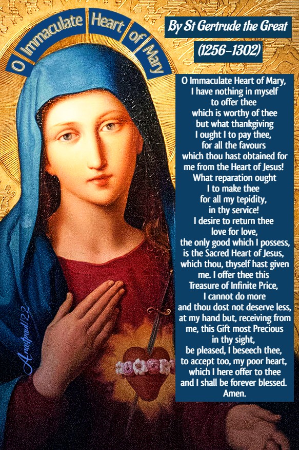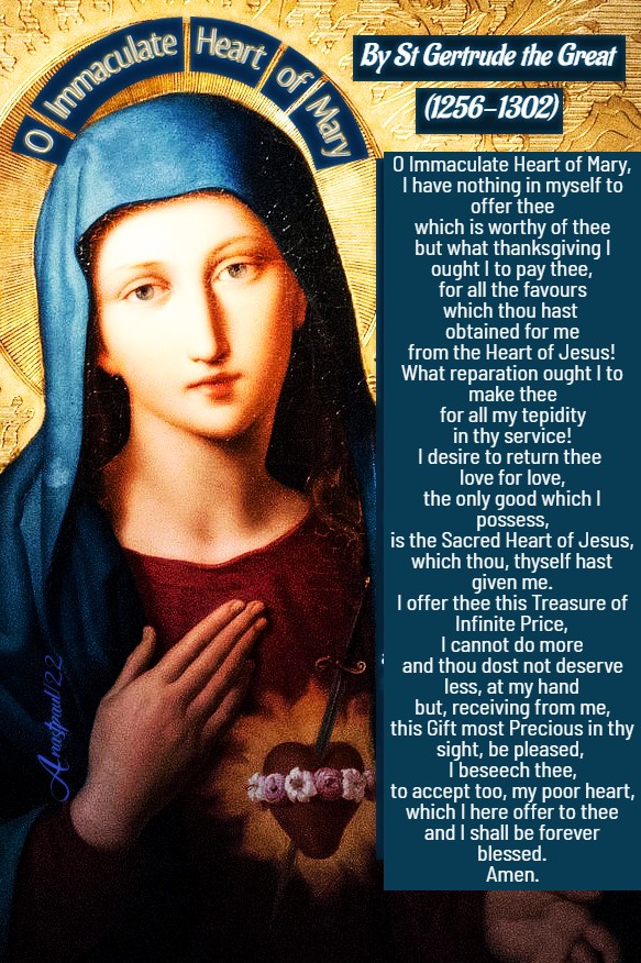 O Immaculate Heart of Mary, I have nothing in myself to offer thee which is worthy of thee but what thanksgiving I ought I to pay thee, for all the favours which thou hast obtained for me from the Heart of Jesus! What reparation ought I to make thee for all my tepidity, in thy service! I desire to return thee love for love, the only good which I possess, is the Sacred Heart of Jesus, which thou, thyself hast given me. I offer thee this Treasure of Infinite Price, I cannot do more and thou dost not deserve less, at my hand but, receiving from me, this Gift most Precious in thy sight, be pleased, I beseech thee, to accept too, my poor heart, which I here offer to thee and I shall be forever blessed. Amen.