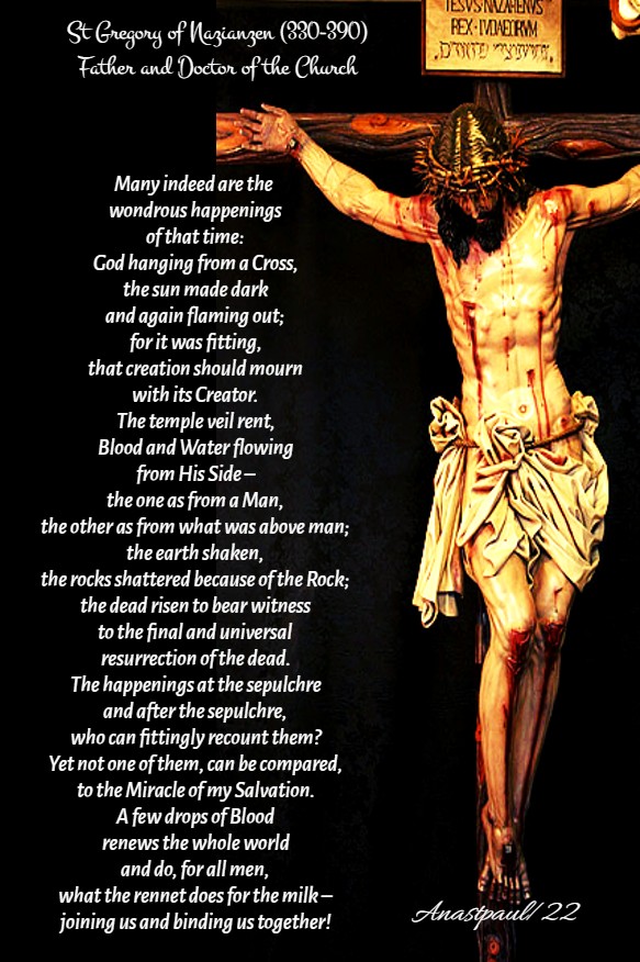 PRAYER – Look with favour on our morning prayer, Lord and in Your saving love, let Your light penetrate the wilderness in our hearts. May no sordid desires darken our minds, renewed and enlightened as we are, by Your heavenly grace. God our Father, You enriched Your Church and gave examples for us to follow in the life and teachings of Sts Basil and Gregory. Grant that, learning Your truth with humility, we may practise it in faith and love. Sts Basil and Gregory, pray for our beloved Church, pray for all Catholic Christians, through Jesus Christ with the Holy Spirit, God forever, amen.