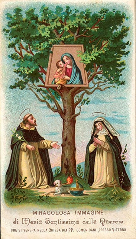 A good knight of Viterbo had many enemies, as will often happen to a follower of Christ. One day he was surprised by his enemies outside the walls of Viterbo. Alone and unarmed and having no way to deal with the mortal danger, he fled into the nearby woods. Fatigued and desperate to reach his destination, the knight heard the cries of the enemy draw nearer and nearer. Eventually he arrived at the oak with the sacred image of Mary, where he fell at her feet with great faith and embraced the trunk of the tree, putting his life into the hands of his Heavenly Mother.
