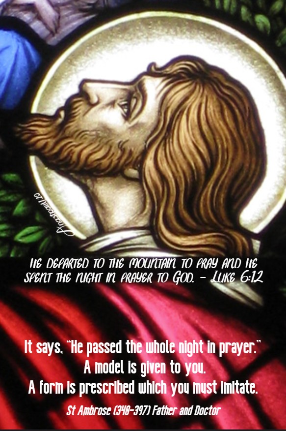 It says, “He passed the whole night in prayer.” A model is given to you. A form is prescribed which you must imitate. Unless I am mistaken, it is nowhere found that He prayed with the apostles. Everywhere He entreats alone, for human prayers do not grasp the counsels of God, nor can anyone share with Christ, in the inward mysteries.” – St Ambrose (340-397) Father and Doctor (Exposition of the Gospel of Luke, 5.)