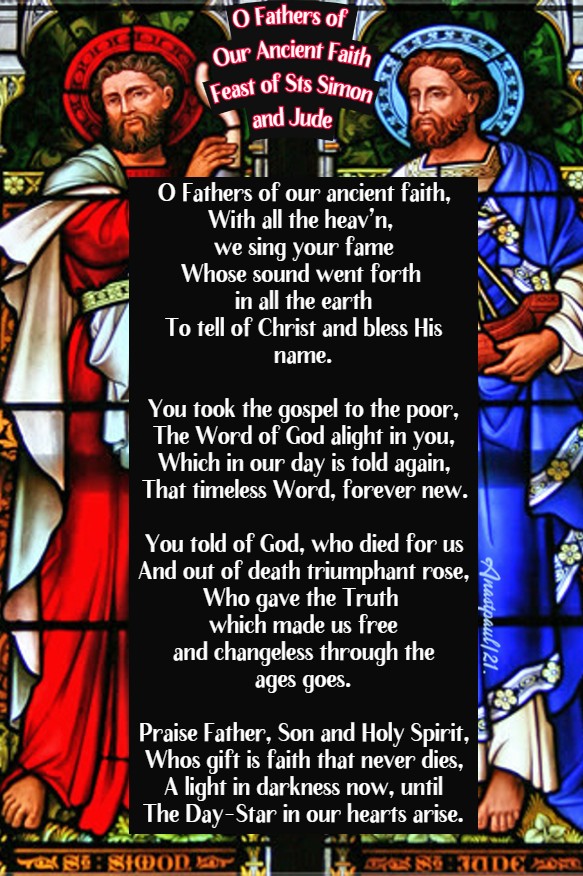 PRAYER – O God, Who has given us a way of coming to know Thy Name through Thy blessed Apostles Simon and Jude, grant us to honour their everlasting glory, by becoming more holy and to become more holy by honouring it. ThroughJesus Christ, Thy Son our Lord, Who lives and reigns with Thee, in the unity of the Holy Ghost, God, world without end. Amen (Collect).
