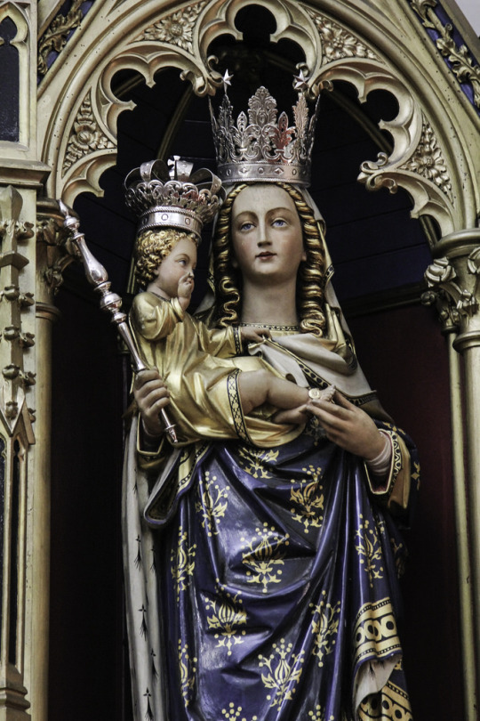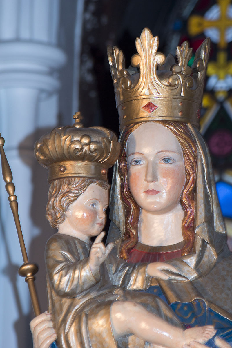 The image of Our Lady is known under various titles, due to the fact, that Mary gives aid, even miraculous aid, when called upon for help. Our Lady of Calevourt is perhaps better known as Our Lady of Good Success, or Our Lady of Aberdeen. We are told that during the Protestant “Reformation,” the figure was taken to Flanders and hidden away by a Catholic family to protect it from profanation. In due course, it fell into the hands of Protestants but this family, received numerous graces and blessing,s which they attributed to the presence of the holy image in their house. They were reconciled to the Church as a result. In 1623 a Spanish captain was given the Statue, with instructions to place it into the hands of Archduchess Isabella. The arrival of the Statue in Brussels is related under several incidents. The same day the ship arrived, the Infanta Isabella won a battle against the Hollanders. The Princess sent the Statue back to Brussles, providing the necessary funds for a Sanctuary she intended to be called Our Lady of Aberdeen. The townspeople greeted the Statue enthusiastically with a procession and placed it in the Chapel but when the victory became known, the name of the Sanctuary was changed and dedicated instead to Our Lady of Good Success. From that time on, Mary travelled from place to place but always her image was saved. During the Terrors of the French Revolution, the Statue was given to an English Catholic who kept it safe until 1805, when it was restored to Belgium. A few years later, the Protestants forced the image to be transferred to a Parish Church in Finistere, where the image now reigns peacefully over her beloved people. The Statue of the Blessed Mother stands with her Divine Child reclining on her right arm, His feet supported by the lift hand of His Mother.