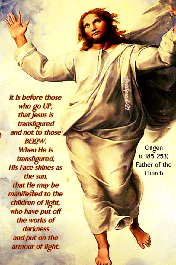 REFLECTION – “Three persons were chosen to climb the mountain, two to appear with the Lord … Peter, who received the keys of the Kingdom of heaven, was one of those who climbed up and John, to whom was entrusted the Mother of Jesus and James, who would be the first to be elevated to the Episcopal dignity. Then Moses and Elijah, the Law and the prophets, appeared together with the Word … Let us, too, climb the mountain, let us beg the Word of God to appear to us in His “splendour and beauty,” to “be strong, go forth in majesty and reign” (Ps 45[44]:4). …